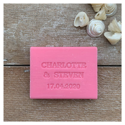 We specialise in creating debossed soaps to order. We can stamp your logo or text of your choice on the soap. Our soaps come in different sizes and in a wide variety of fragrances and colours, they are made from quality ingredients and vegetable oils only and our fragrances are created by French perfumers.